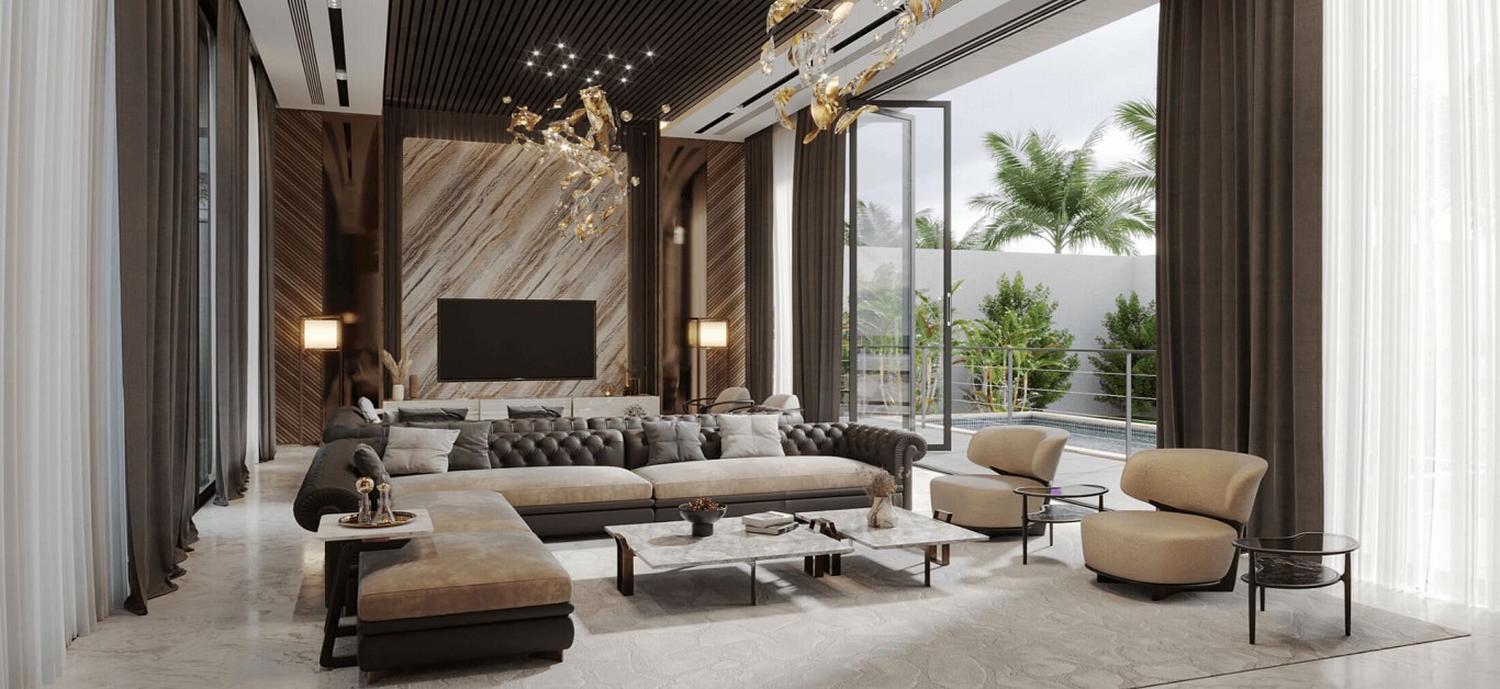 The architecture combines modern and traditional styles with a clean, timeless look. The entrance and shared spaces are warm and welcoming.